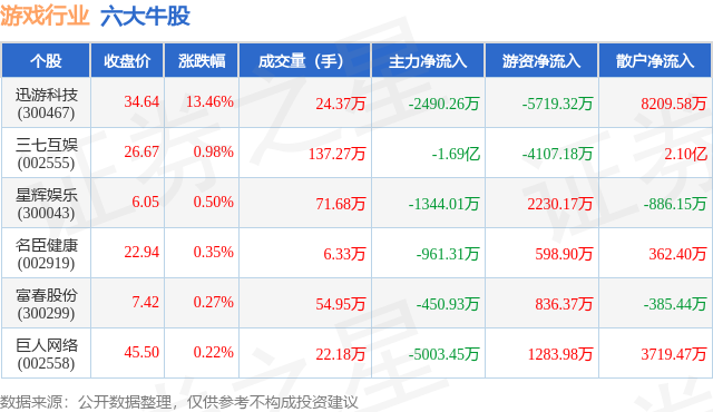 个股表现方面,游戏行业当日领涨股为迅游科技(300467),该股当日报收34.64,上涨13.46%,成交量24.37万,主力资金净流出2490.26万元。三七互娱(002555)以上涨0.98%紧随其后,该股当日成交量137.27万,主力资金净流出1.69亿元。除此之外,星辉娱乐(300043)、名臣健康(002919)、富春股份(300299)均进入当日牛股之列。具体个股列表见下表: