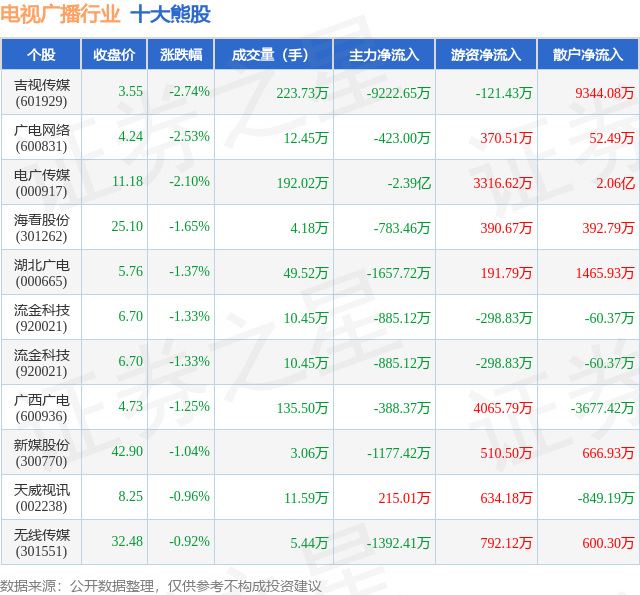 个股表现方面,电视广播行业当日领跌股为吉视传媒(601929),该股当日报收3.55,下跌2.74%,成交量223.73万,主力资金净流出9222.65万元。广电网络(600831)以下跌2.53%紧随其后,该股当日成交量12.45万,主力资金净流出423.0万元。除此之外,电广传媒(000917)、海看股份(301262)、湖北广电(000665)均进入当日熊股之列。具体个股列表见下表: