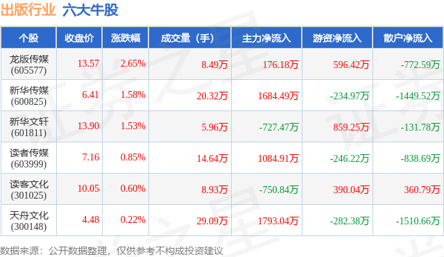 个股表现方面,出版行业当日领涨股为龙版传媒(605577),该股当日报收13.57,上涨2.65%,成交量8.49万,主力资金净流入176.18万元。新华传媒(600825)以上涨1.58%紧随其后,该股当日成交量20.32万,主力资金净流入1684.49万元。除此之外,新华文轩(601811)、读者传媒(603999)、读客文化(301025)均进入当日牛股之列。具体个股列表见下表: