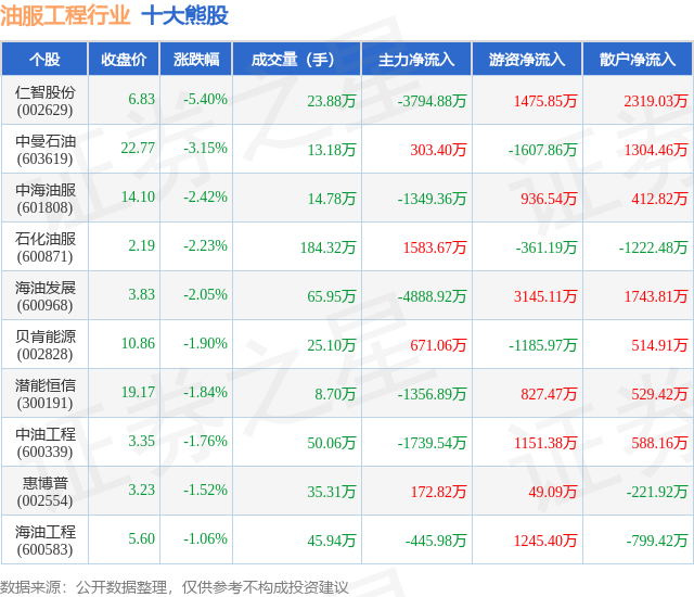 个股表现方面,油服工程行业当日领跌股为仁智股份(002629),该股当日报收6.83,下跌5.4%,成交量23.88万,主力资金净流出3794.88万元。中曼石油(603619)以下跌3.15%紧随其后,该股当日成交量13.18万,主力资金净流入303.4万元。除此之外,中海油服(601808)、石化油服(600871)、海油发展(600968)均进入当日熊股之列。具体个股列表见下表: