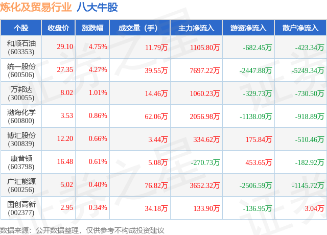 个股表现方面,炼化及贸易行业当日领涨股为和顺石油(603353),该股当日报收29.1,上涨4.75%,成交量11.79万,主力资金净流入1105.8万元。统一股份(600506)以上涨4.27%紧随其后,该股当日成交量39.55万,主力资金净流入7697.22万元。除此之外,万邦达(300055)、渤海化学(600800)、博汇股份(300839)均进入当日牛股之列。具体个股列表见下表: