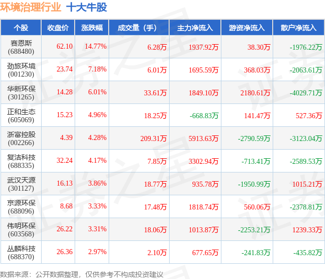 个股表现方面,环境治理行业当日领涨股为赛恩斯(688480),该股当日报收62.1,上涨14.77%,成交量6.28万,主力资金净流入1937.92万元。劲旅环境(001230)以上涨7.18%紧随其后,该股当日成交量6.01万,主力资金净流入1695.59万元。除此之外,华新环保(301265)、正和生态(605069)、浙富控股(002266)均进入当日牛股之列。具体个股列表见下表: