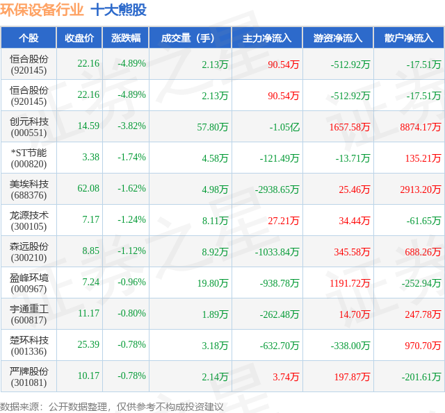 个股表现方面,环保设备行业当日领跌股为恒合股份(920145),该股当日报收22.16,下跌4.89%,成交量2.13万,主力资金净流入90.54万元。恒合股份(920145)以下跌4.89%紧随其后,该股当日成交量2.13万,主力资金净流入90.54万元。除此之外,创元科技(000551)、*ST节能(000820)、美埃科技(688376)均进入当日熊股之列。具体个股列表见下表: