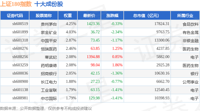 证券之星消息,1月7日,上证180(000010)指数报收于10400.93点,跌0.05%,成交3582.37亿元,换手率0.58%。当日该指数成份股中,上涨的有67家,盛美上海以7.03%的涨幅领涨,下跌的有111家,中国海油以4.03%的跌幅领跌。