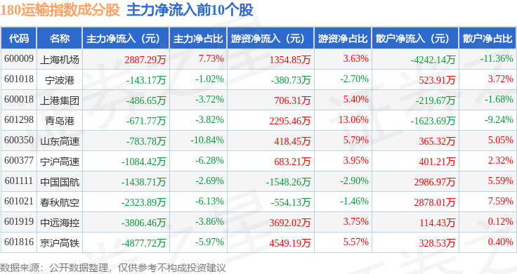 资金流向方面,180运输(000027)指数成份股当日主力资金净流出合计7.55亿元,游资资金净流入合计4.21亿元,散户资金净流入合计3.34亿元。成份股资金流向详情见下表:
