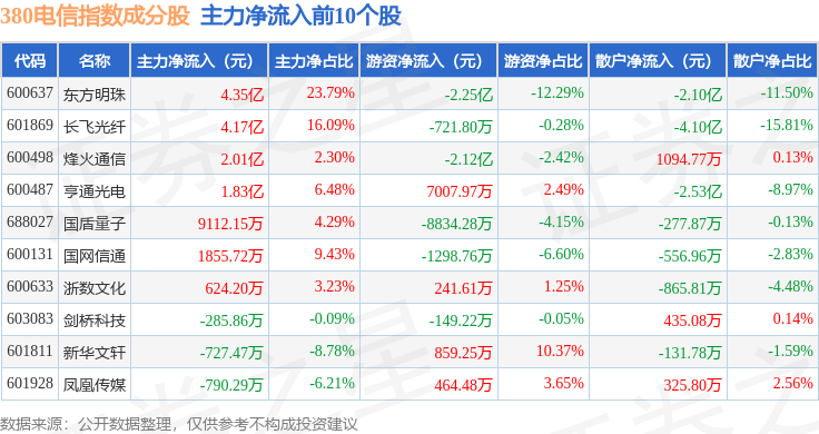 资金流向方面,380电信(000112)指数成份股当日主力资金净流入合计9.57亿元,游资资金净流出合计3.95亿元,散户资金净流出合计5.62亿元。成份股资金流向详情见下表: