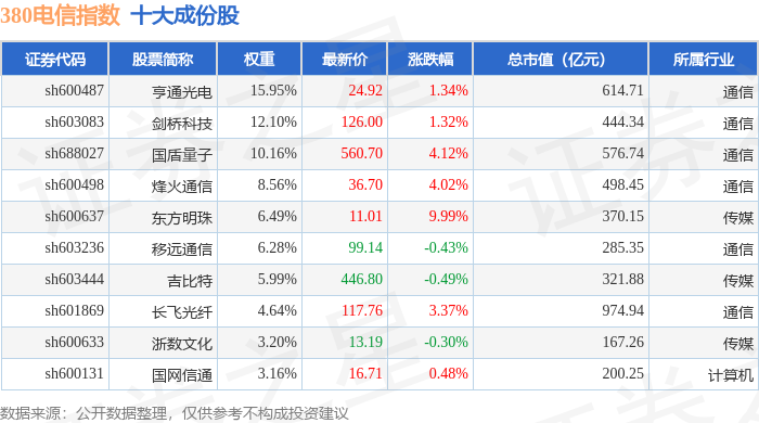 证券之星消息,1月7日,380电信(000112)指数报收于6410.78点,涨1.64%,成交274.09亿元,换手率3.59%。当日该指数成份股中,上涨的有8家,东方明珠以9.99%的涨幅领涨,下跌的有14家,山东出版以2.69%的跌幅领跌。