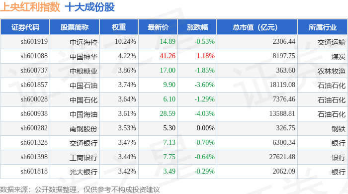 上央红利(000152)指数十大成份股详情如下: