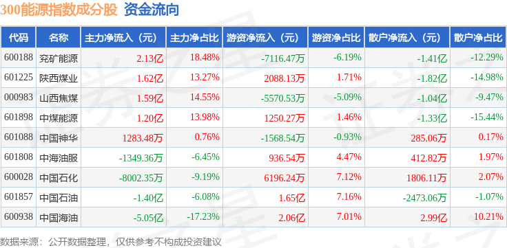 资金流向方面,300能源(000908)指数成份股当日主力资金净流出合计7222.64万元,游资资金净流入合计3.33亿元,散户资金净流出合计2.61亿元。成份股资金流向详情见下表: