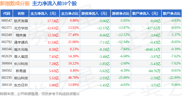 资金流向方面,新指数(399100)成份股当日主力资金净流出合计453.29亿元,游资资金净流入合计42.55亿元,散户资金净流入合计410.74亿元。成份股资金流向详情见下表: