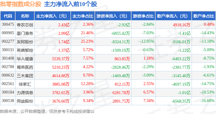 资金流向方面,批零指数(399236)成份股当日主力资金净流入合计3.17亿元,游资资金净流入合计298.94万元,散户资金净流出合计3.2亿元。成份股资金流向详情见下表: