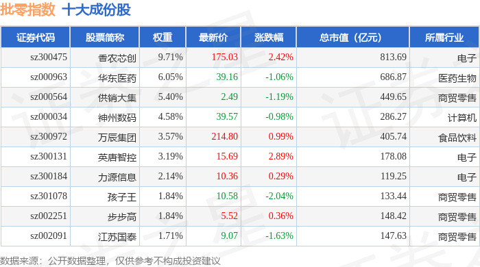 批零指数(399236)十大成份股详情如下: