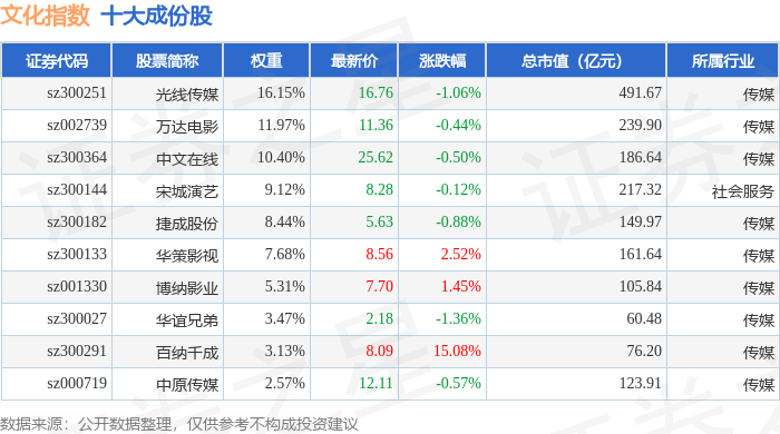 文化指数(399248)十大成份股详情如下: