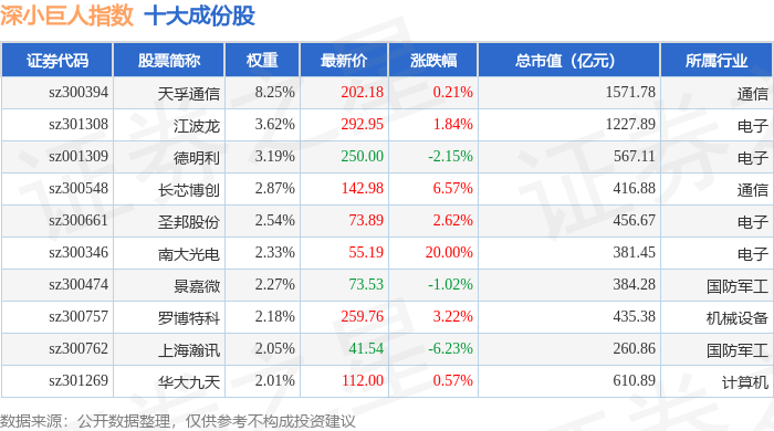 证券之星消息,1月7日,深小巨人(399268)指数报收于2238.46点,涨1.69%,成交1218.82亿元,换手率7.09%。当日该指数成份股中,上涨的有55家,南大光电以20.0%的涨幅领涨,下跌的有45家,国科微以7.46%的跌幅领跌。