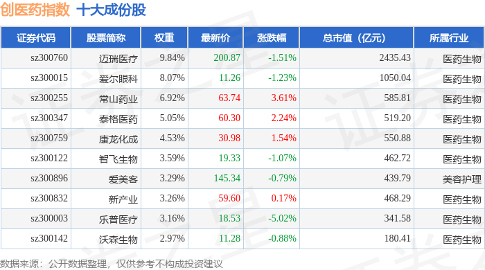 证券之星消息,1月7日,创医药(399275)指数报收于2769.45点,涨0.41%,成交304.19亿元,换手率2.38%。当日该指数成份股中,上涨的有18家,美好医疗以20.01%的涨幅领涨,下跌的有32家,乐普医疗以5.02%的跌幅领跌。