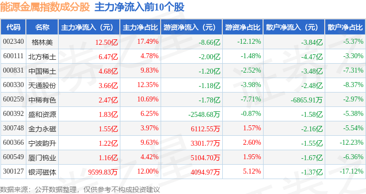 资金流向方面,能源金属(399366)指数成份股当日主力资金净流入合计20.23亿元,游资资金净流出合计10.03亿元,散户资金净流出合计9.88亿元。成份股资金流向详情见下表: