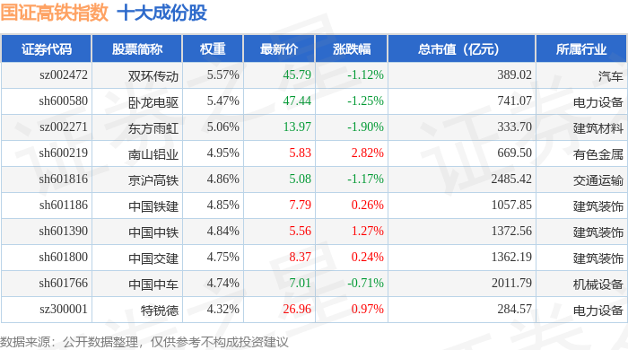 国证高铁(399419)指数十大成份股详情如下: