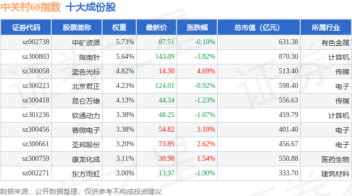 证券之星消息,1月7日,中关村60(399697)指数报收于4038.14点,跌0.07%,成交905.54亿元,换手率6.15%。当日该指数成份股中,上涨的有22家,三博脑科以10.45%的涨幅领涨,下跌的有38家,华力创通以7.04%的跌幅领跌。