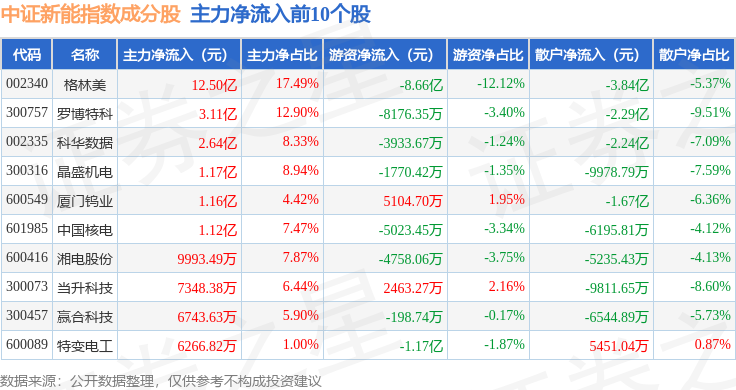 资金流向方面,中证新能(399808)指数成份股当日主力资金净流出合计46.68亿元,游资资金净流入合计4.24亿元,散户资金净流入合计42.32亿元。成份股资金流向详情见下表: