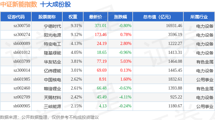 证券之星消息,1月7日,中证新能(399808)指数报收于2943.88点,涨0.66%,成交1526.13亿元,换手率2.28%。当日该指数成份股中,上涨的有35家,中伟股份以11.97%的涨幅领涨,下跌的有43家,湖南裕能以4.31%的跌幅领跌。