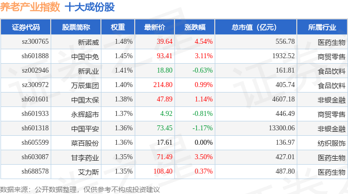 养老产业(399812)指数十大成份股详情如下: