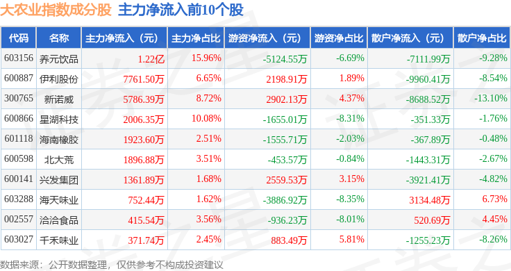 资金流向方面,大农业(399814)指数成份股当日主力资金净流出合计11.69亿元,游资资金净流入合计4.46亿元,散户资金净流入合计7.23亿元。成份股资金流向详情见下表: