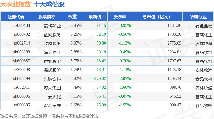 大农业(399814)指数十大成份股详情如下: