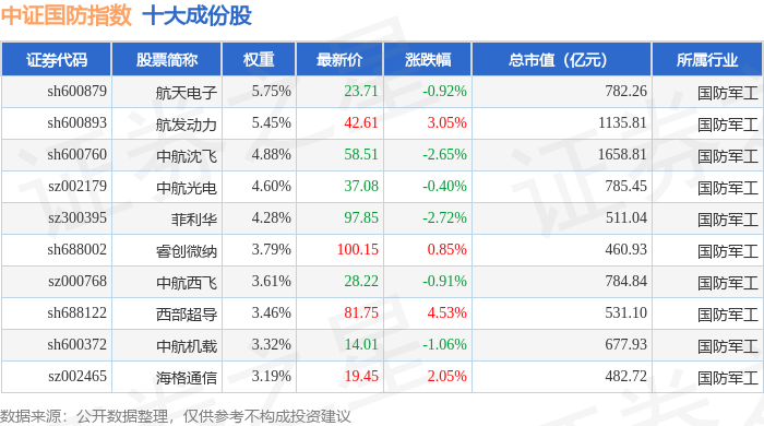 证券之星消息,1月7日,中证国防(399973)指数报收于1955.21点,跌0.39%,成交957.81亿元,换手率5.97%。当日该指数成份股中,上涨的有14家,北方导航以9.99%的涨幅领涨,下跌的有35家,中科星图以6.05%的跌幅领跌。