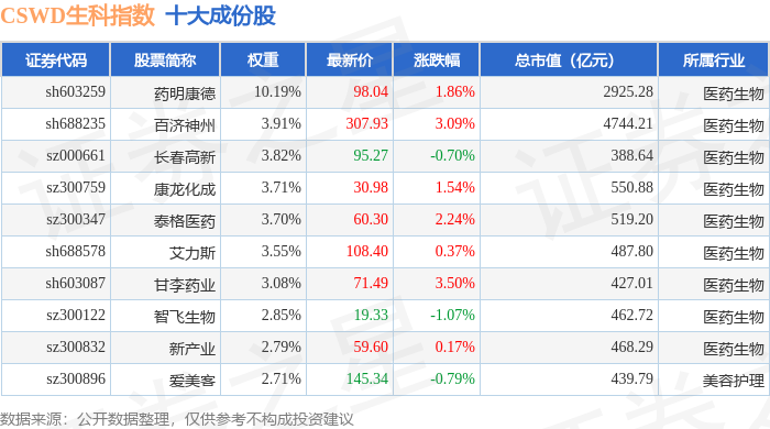 CSWD生科(399993)指数十大成份股详情如下: