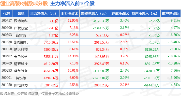 资金流向方面,创业高装R(470040)指数成份股当日主力资金净流出合计13.65亿元,游资资金净流入合计5.07亿元,散户资金净流入合计8.58亿元。成份股资金流向详情见下表:
