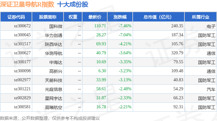 深证卫星导航R(470050)指数十大成份股详情如下: