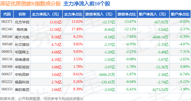 资金流向方面,深证优质信披R(470065)指数成份股当日主力资金净流出合计203.7亿元,游资资金净流入合计24.16亿元,散户资金净流入合计179.54亿元。成份股资金流向详情见下表: