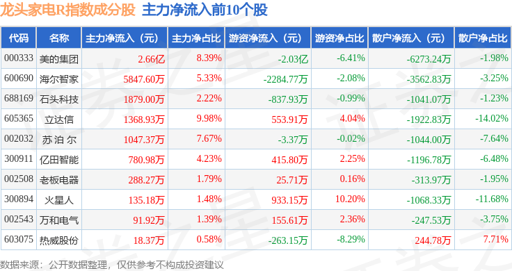 资金流向方面,龙头家电R(480028)指数成份股当日主力资金净流出合计18.85亿元,游资资金净流出合计2361.87万元,散户资金净流入合计19.08亿元。成份股资金流向详情见下表: