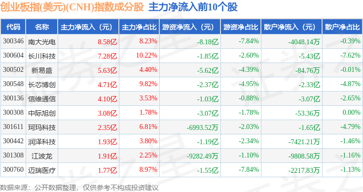 资金流向方面,创业板指(美元)(CNH)(970007)指数成份股当日主力资金净流出合计66.6亿元,游资资金净流入合计2.37亿元,散户资金净流入合计64.23亿元。成份股资金流向详情见下表: