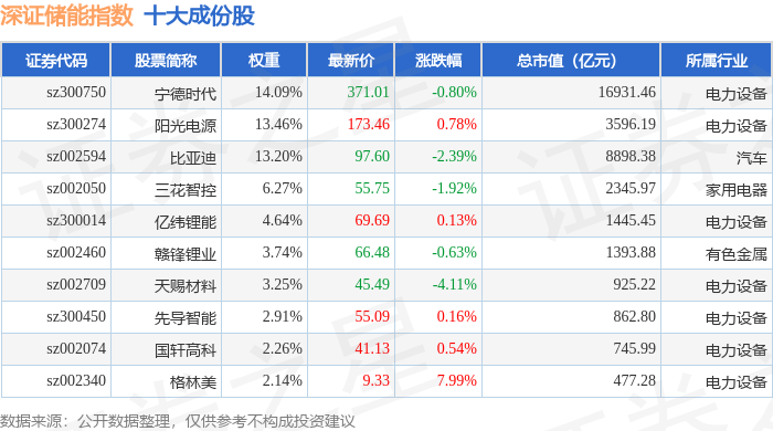 深证储能(970036)指数十大成份股详情如下: