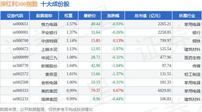 证券之星消息,1月7日,深红利300(970062)指数报收于5718.1点,跌0.34%,成交2640.75亿元,换手率2.2%。当日该指数成份股中,上涨的有109家,厦门港务以10.02%的涨幅领涨,下跌的有188家,兔宝宝以6.15%的跌幅领跌。