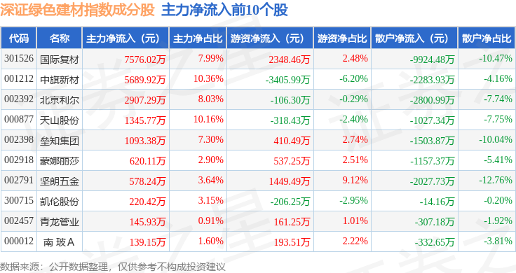资金流向方面,深证绿色建材(970077)指数成份股当日主力资金净流出合计7149.39万元,游资资金净流入合计1.96亿元,散户资金净流出合计1.25亿元。成份股资金流向详情见下表: