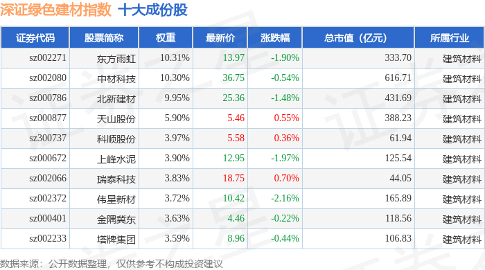 深证绿色建材(970077)指数十大成份股详情如下: