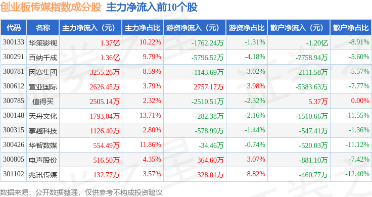资金流向方面,创业板传媒(970084)指数成份股当日主力资金净流出合计21.03亿元,游资资金净流入合计4.1亿元,散户资金净流入合计16.93亿元。成份股资金流向详情见下表:
