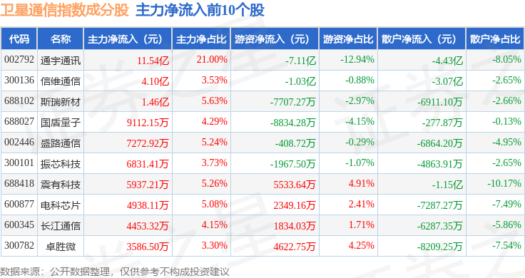 资金流向方面,卫星通信(980018)指数成份股当日主力资金净流出合计76.46亿元,游资资金净流入合计22.12亿元,散户资金净流入合计54.41亿元。成份股资金流向详情见下表: