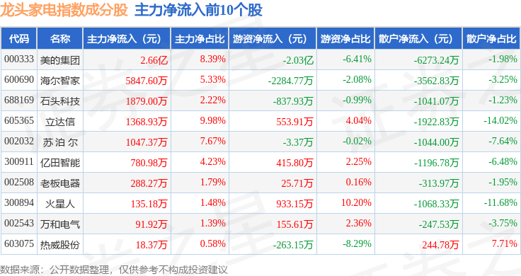 资金流向方面,龙头家电(980028)指数成份股当日主力资金净流出合计18.85亿元,游资资金净流出合计2361.87万元,散户资金净流入合计19.08亿元。成份股资金流向详情见下表: