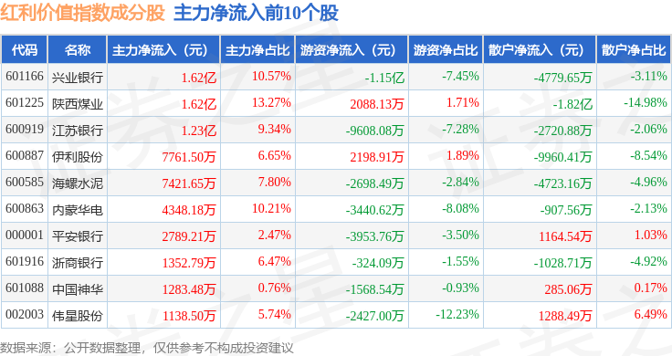 资金流向方面,红利价值(980103)指数成份股当日主力资金净流出合计18.36亿元,游资资金净流入合计9.23亿元,散户资金净流入合计9.13亿元。成份股资金流向详情见下表: