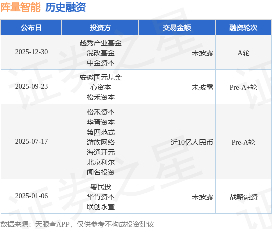 证券之星消息,根据天眼查APP于12月30日公布的信息整理,上海阵量智能科技有限公司A轮融资,融资额未披露,参与投资的机构包括越秀产业基金,混改基金,中金资本。