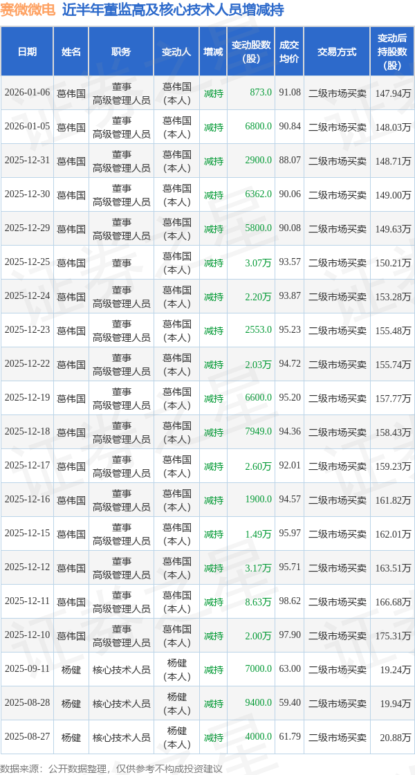 赛微微电近半年内的董监高及核心技术人员增减持详情如下: