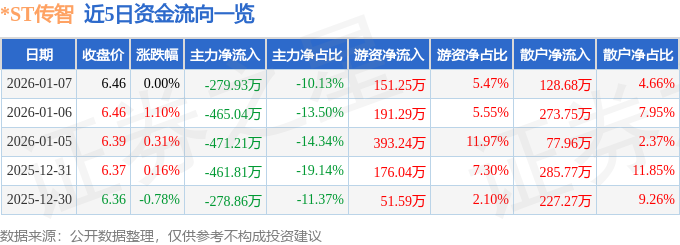证券之星消息,截至2026年1月7日收盘,*ST传智(003032)报收于6.46元,上涨0.0%,换手率1.55%,成交量4.27万手,成交额2763.23万元。