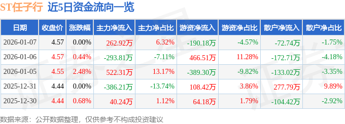 1月7日的资金流向数据方面,主力资金净流入262.92万元,占总成交额6.32%,游资资金净流出190.18万元,占总成交额4.57%,散户资金净流出72.74万元,占总成交额1.75%。