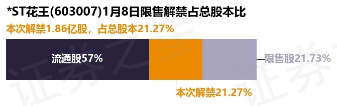 证券之星消息,根据市场公开信息整理,*ST花王(603007)于1月8日将有1.86亿股限售股份解禁,为公司其他类型,占公司总股本21.27%。(本次数据根据历史公告整理得出,实际情况以上市公司最新公告为准)本次解禁后,公司还有1.91亿股限售股份,占总股本21.73%。具体如下图所示: