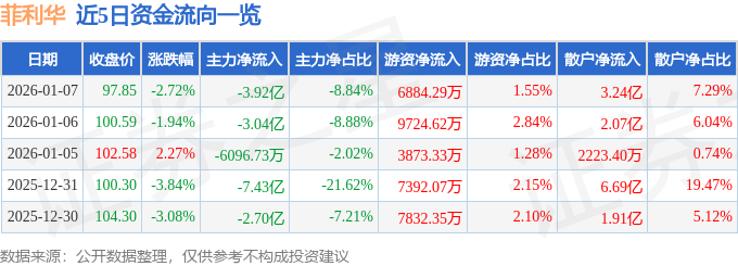 证券之星消息,截至2026年1月7日收盘,菲利华(300395)报收于97.85元,下跌2.72%,换手率9.05%,成交量46.3万手,成交额44.39亿元。