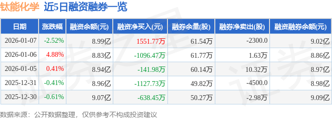 钛能化学融资融券信息显示,融资方面,当日融资买入5482.92万元,融资偿还3931.16万元,融资净买入1551.77万元。融券方面,融券卖出1.94万股,融券偿还2.17万股,融券余量61.54万股,融券余额309.55万元。融资融券余额9.02亿元。
