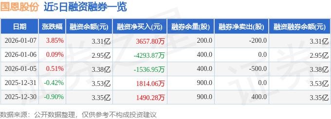 证券之星消息,截至2026年1月7日收盘,国恩股份(002768)报收于55.04元,上涨3.85%,换手率2.94%,成交量5.2万手,成交额2.84亿元。